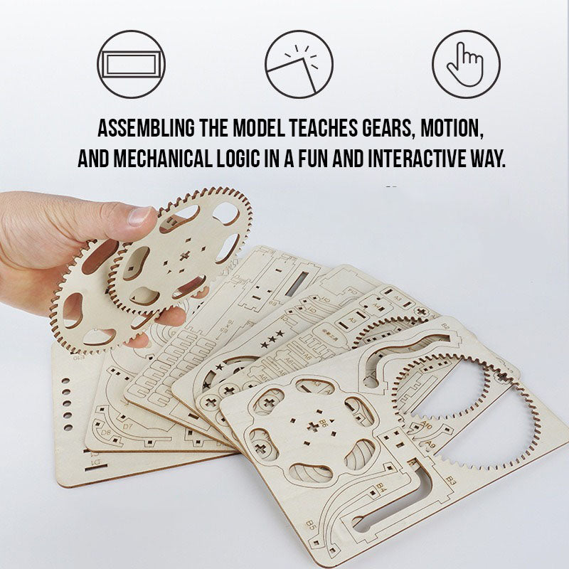 Assembling the model teaches gears, motion, and mechanical logic in a fun and interactive way.