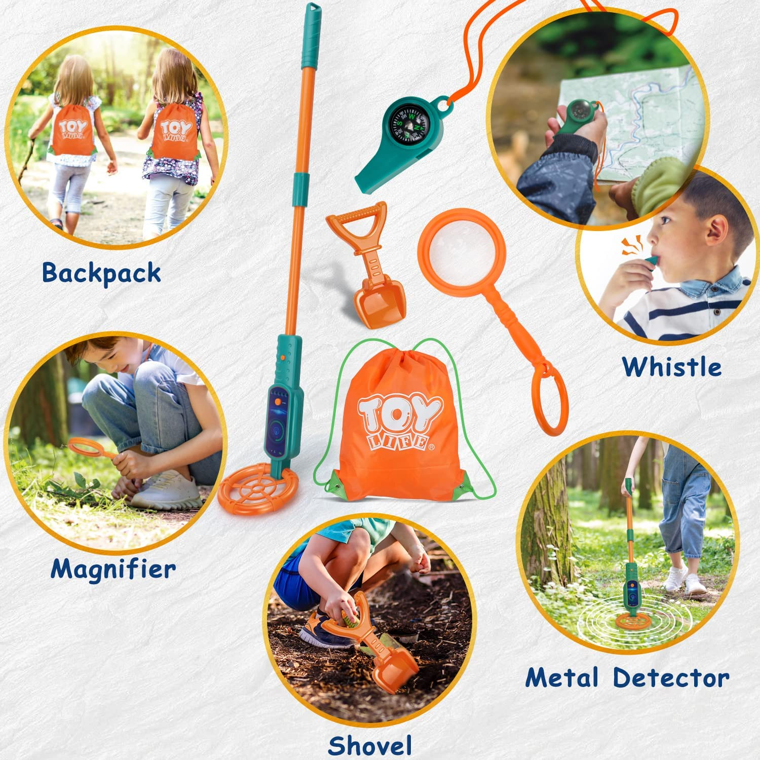 Yes, the set includes a shovel, magnifying glass, and explorer whistle for a full treasure hunting experience.