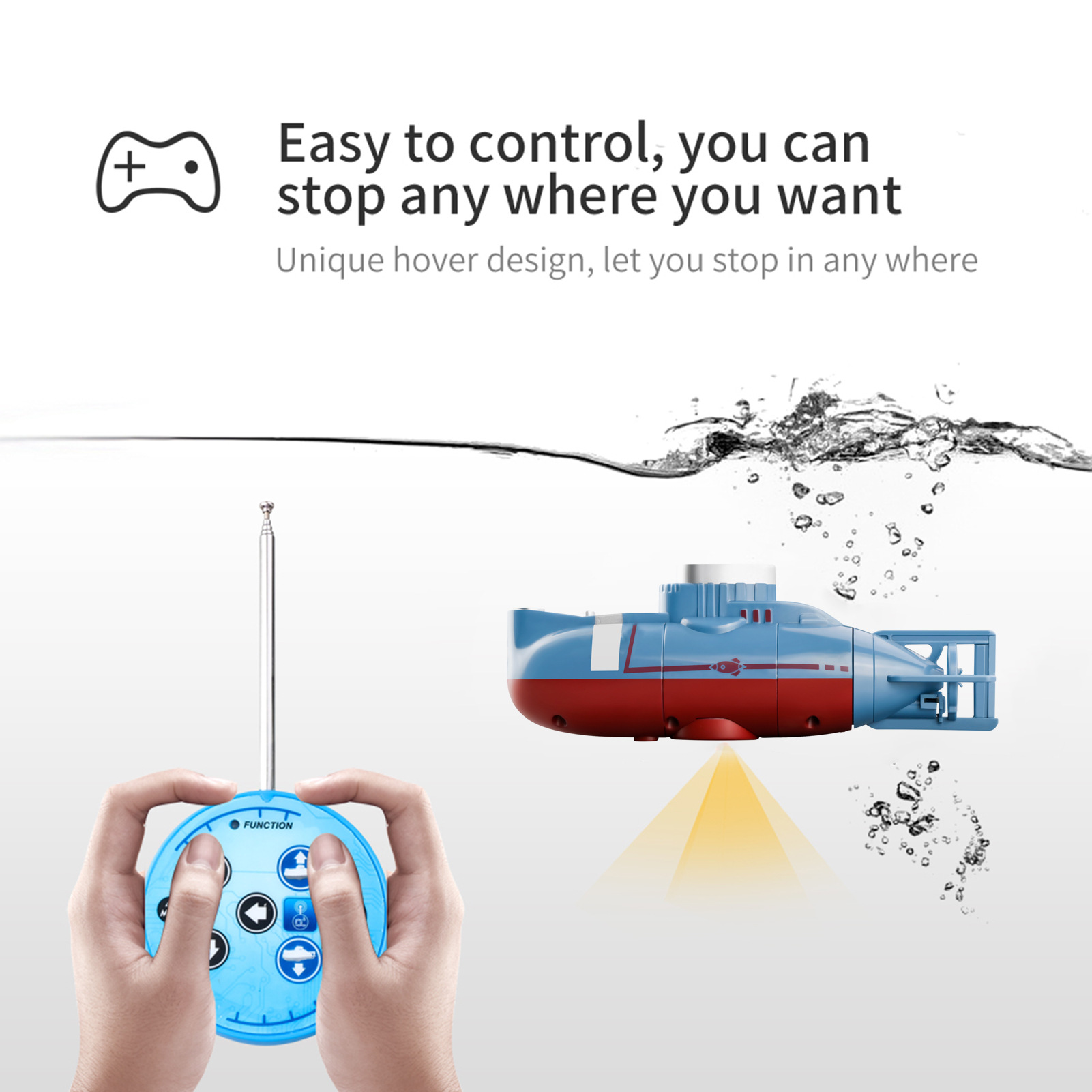 Both the submarine and controller are waterproof to prevent short circuits. The motor only activates in water, keeping hands safe when handling.